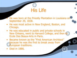 Henry Hobson Richardson was an American architect born in 1838 in Louisiana. He studied in New Orleans and Paris and is considered the first American architect for breaking from European traditions. He developed the Richardsonian Romanesque style characterized by stone walls, arched windows, and dynamic interior spaces. His most famous work was Trinity Church in Boston constructed from 1872-1877, which featured a clay roof, rough stone, heavy arches, and a massive tower. Geometry played an important role in the symmetrical and Victorian design of the church, ensuring its structural integrity and longevity.