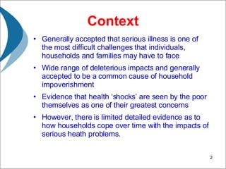 This document discusses measuring the linkages between health and livelihoods in order to design effective interventions. It notes that serious illness can greatly impact individuals, households, and families through reduced income, increased healthcare costs, and selling of assets. However, the impacts are complex as health problems vary in severity and duration. The document also examines different research methods and their limitations in fully capturing how households cope with health issues over time. It then describes the "Poverty and Illness" project which aims to better understand the livelihood impacts of major illnesses through in-depth interviews with households selected via probability sampling.