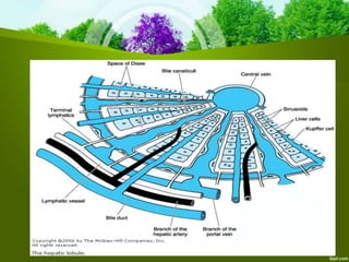 This document discusses the anatomy, physiology, and functions of the liver as they relate to anesthesia. It begins with an overview of hepatic anatomy including gross and microscopic structure, blood supply, and drainage. It then covers hepatic blood flow regulation by intrinsic and extrinsic factors and how anesthesia can affect blood flow. The major sections discuss hepatic functions such as metabolism, synthesis, and detoxification. In particular, it notes the liver's roles in glucose regulation, protein and lipid metabolism, coagulation factor production, and bilirubin metabolism.