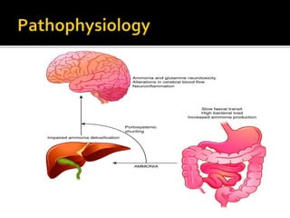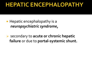 Hepatic encephalopathy is a neuropsychiatric syndrome resulting from acute or chronic liver failure, causing toxins to affect the central nervous system. Symptoms range from confusion to coma, with treatments focusing on identifying and removing precipitating factors, dietary restrictions on protein, and specific medications like lactulose and antibiotics. In severe cases, liver transplantation may be considered for nonresponsive patients.