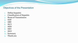 1. Hepatitis is defined as inflammation of the liver caused by viruses. There are 5 main hepatitis viruses - Hepatitis A, B, C, D, and E viruses. Hepatitis B is the only DNA virus, while the others are RNA viruses.