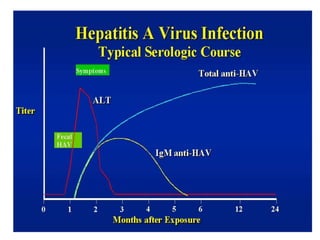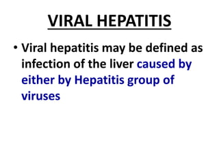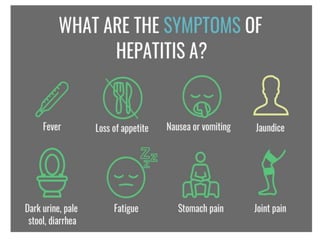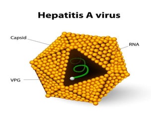 This document provides information about Hepatitis A virus (HAV) and Hepatitis A disease. It states that HAV is the causative agent of Hepatitis A, an acute infectious disease. The virus is transmitted primarily through the fecal-oral route. Symptoms include fever, jaundice, and fatigue. While the disease is usually self-limiting, vaccination and improved sanitation can help prevent transmission.