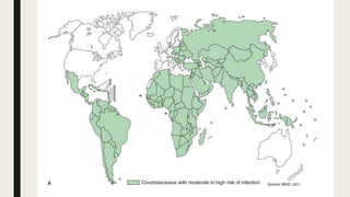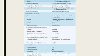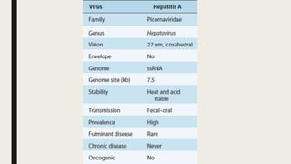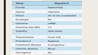 Hepatitis can be caused by several viruses and other factors. Hepatitis A virus (HAV) causes an acute form of hepatitis that is often self-limiting. HAV is transmitted through the fecal-oral route and spreads through contaminated food or water. It has an incubation period of 4 weeks and causes liver inflammation. Hepatitis E virus (HEV) also causes an acute form of hepatitis through contaminated food or water. While self-limiting in most patients, HEV infection during pregnancy can lead to fulminant liver failure and death, especially in the third trimester. Prevention efforts focus on handwashing and water treatment to prevent transmission.