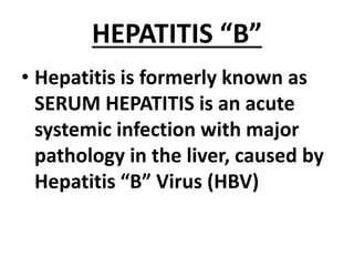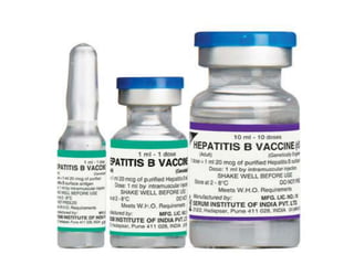 Hepatitis B is caused by the hepatitis B virus (HBV) and causes liver infection and inflammation. It is transmitted through contact with infected blood or bodily fluids. HBV can cause both acute and chronic infection. Chronic infection may lead to serious complications like cirrhosis and liver cancer. Hepatitis B is preventable through vaccination, which induces protective antibody levels in over 95% of people vaccinated.