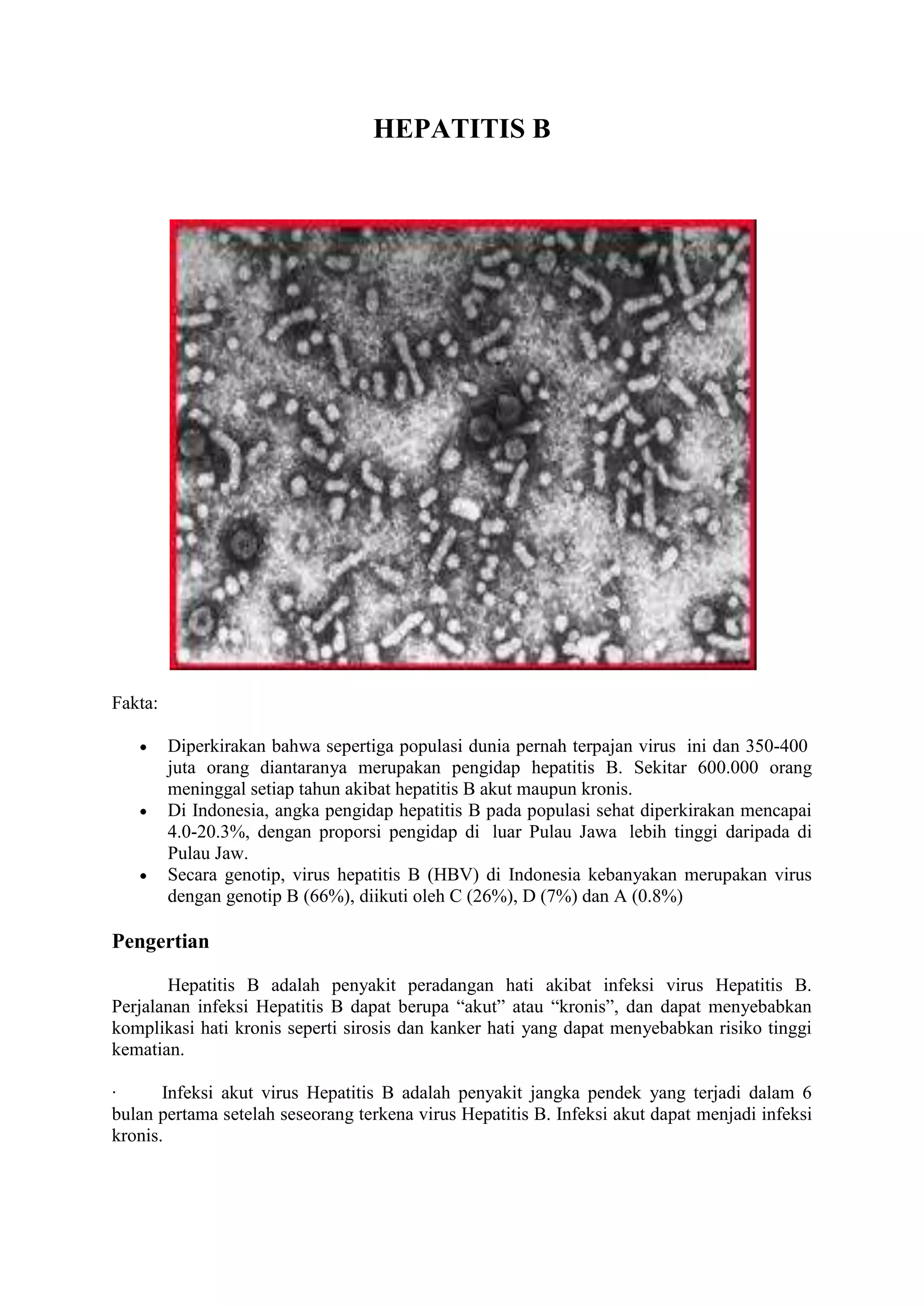 Hepatitis B adalah infeksi virus yang mempengaruhi hati, dengan hingga 400 juta orang terinfeksi secara global dan menyebabkan ratusan ribu kematian setiap tahunnya. Penyebaran virus ini sering terjadi melalui kontak dengan cairan tubuh yang terinfeksi, dan risiko kontraksi meningkat pada bayi serta anak-anak. Pencegahan yang efektif termasuk vaksinasi dan tindakan pencegahan perilaku, khususnya di kalangan individu berisiko tinggi.