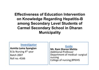 The study assessed the effectiveness of an educational intervention on knowledge of hepatitis B among secondary school students in Nepal. It found that: