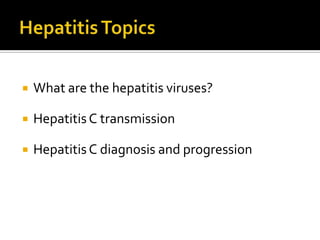 This document provides information about viral hepatitis, focusing on hepatitis A, B, and C. It discusses the transmission, symptoms, diagnosis, and long-term effects of each virus. Hepatitis A and B can be prevented through vaccines, while hepatitis C has no vaccine and is transmitted through blood. Over time, untreated hepatitis C can lead to cirrhosis or liver cancer, though many people have no symptoms for decades. Genotypes determine treatment options for hepatitis C.