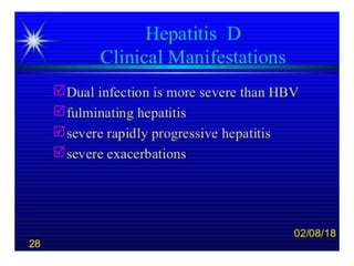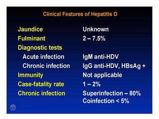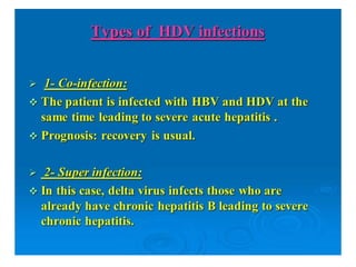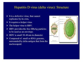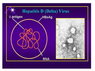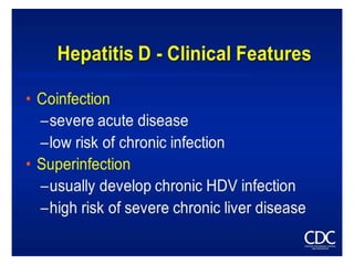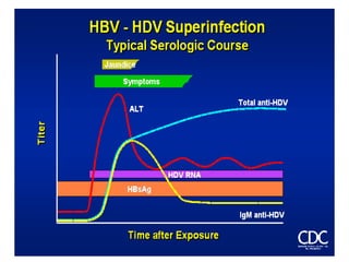 Hepatitis D is caused by the Hepatitis D virus (HDV) and requires co-infection with Hepatitis B. HDV is found worldwide but prevalence is highest in Italy, the Middle East, Central Asia, West Africa, and South America. HDV transmission occurs through the same routes as HBV, except it is not sexually transmitted. Infection depends on HBV replication as HBV provides the envelope for HDV. HDV infection is diagnosed through an HDV antibody test.