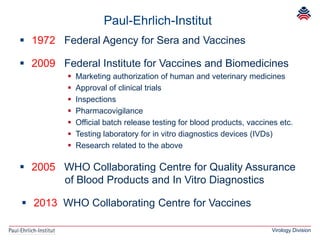 The document summarizes a meeting presentation about hepatitis E virus (HEV) diagnostics and standardization. It discusses the need for accurate HEV diagnosis, issues with current assays, and efforts to develop international standards for HEV RNA testing led by the Paul-Ehrlich-Institut. This included two collaborative studies establishing the first WHO International Standard for HEV RNA and developing a reference panel representing all HEV genotypes to improve assay performance evaluation.