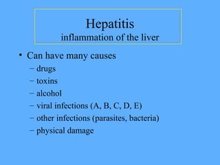 The document provides an overview of hepatitis A, B, and C viruses, including their causes, symptoms, transmission methods, prevention strategies, and treatment options. It highlights the risk factors associated with each type of hepatitis, noting the serious health implications such as liver damage and cancer. Important preventive measures include vaccination, good hygiene practices, and awareness of risk factors to reduce transmission.