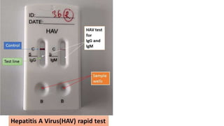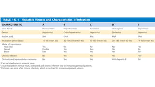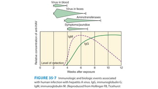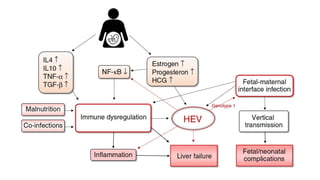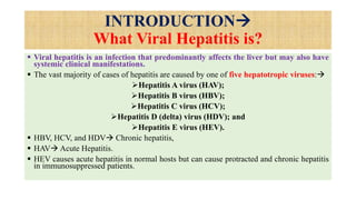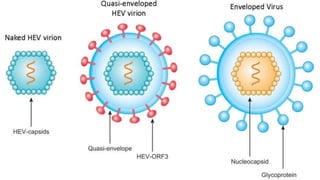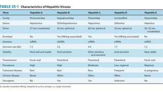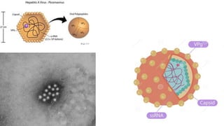 The document provides a comprehensive overview of hepatitis viruses A and E, detailing their clinical manifestations, pathogenesis, laboratory features, and management. Hepatitis A virus (HAV) primarily causes acute illness through fecal-oral transmission, while Hepatitis E virus (HEV) can lead to severe disease in immunocompromised individuals and during pregnancy. The documen also discusses the chronic effects of Hepatitis B and C viruses, highlighting the potential for liver failure and the importance of vaccination and hygiene in prevention.