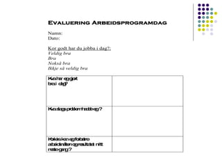 Arbeidsprogram Individuell målog oppgåver Ny plan kvar 14. dag Elevane vel sjølv: Korleis dei skal jobbe, aleine – gruppe Kva slags rom dei skal jobbe i Kor på programmet dei vil starte. Læringsstil