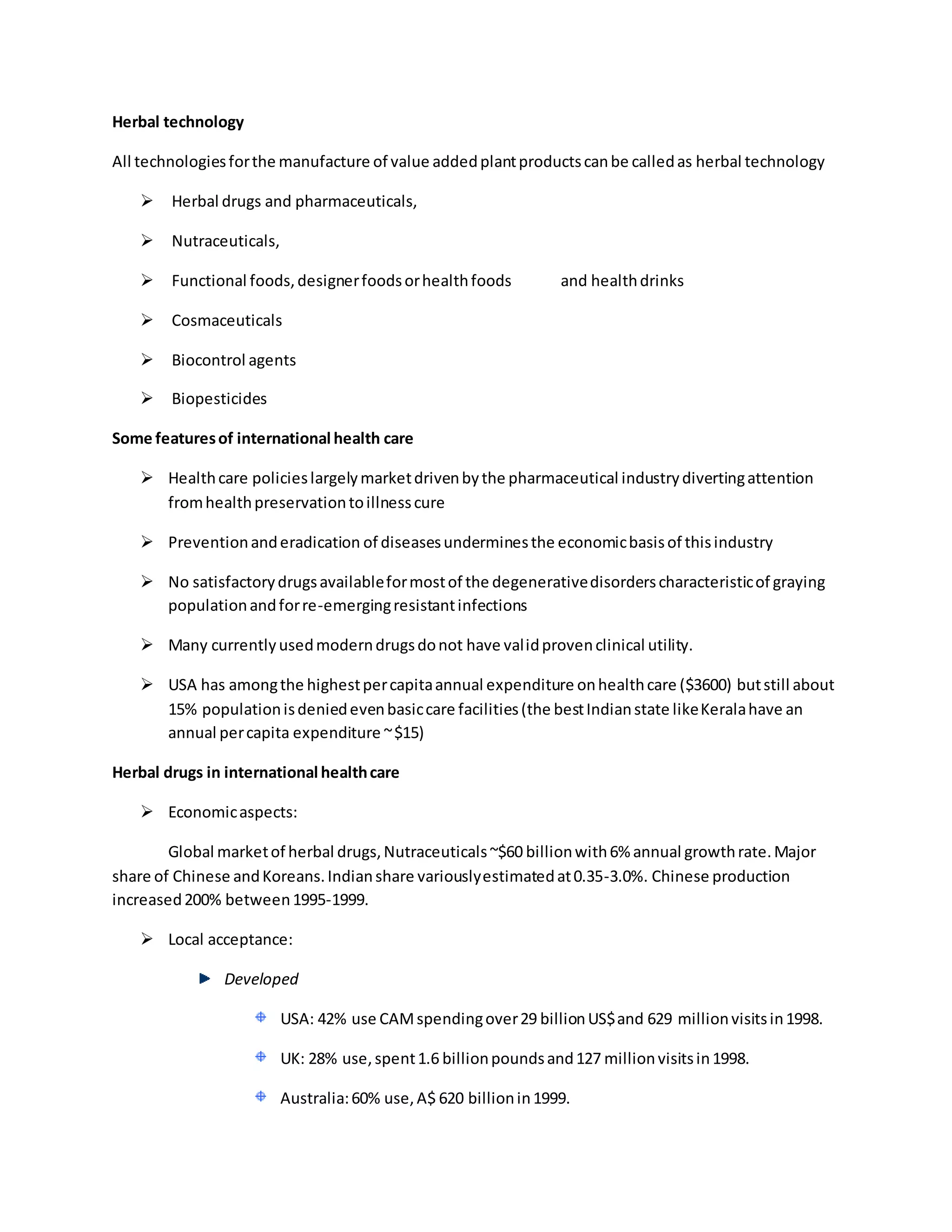 This document discusses herbal technology and international healthcare trends related to herbal drugs. It notes that the global market for herbal drugs and nutraceuticals is about $60 billion annually, with Chinese and Korean companies currently holding a major share. Herbal drugs are well-suited for conditions like infectious diseases, degenerative disorders, and metabolic diseases. Standardization of herbal drugs is important and includes authentication of raw plant materials, formulation processes, toxicity evaluation, and stability testing. The document also outlines research objectives for improving Ayurvedic drug formulations and their inclusion in modern healthcare.