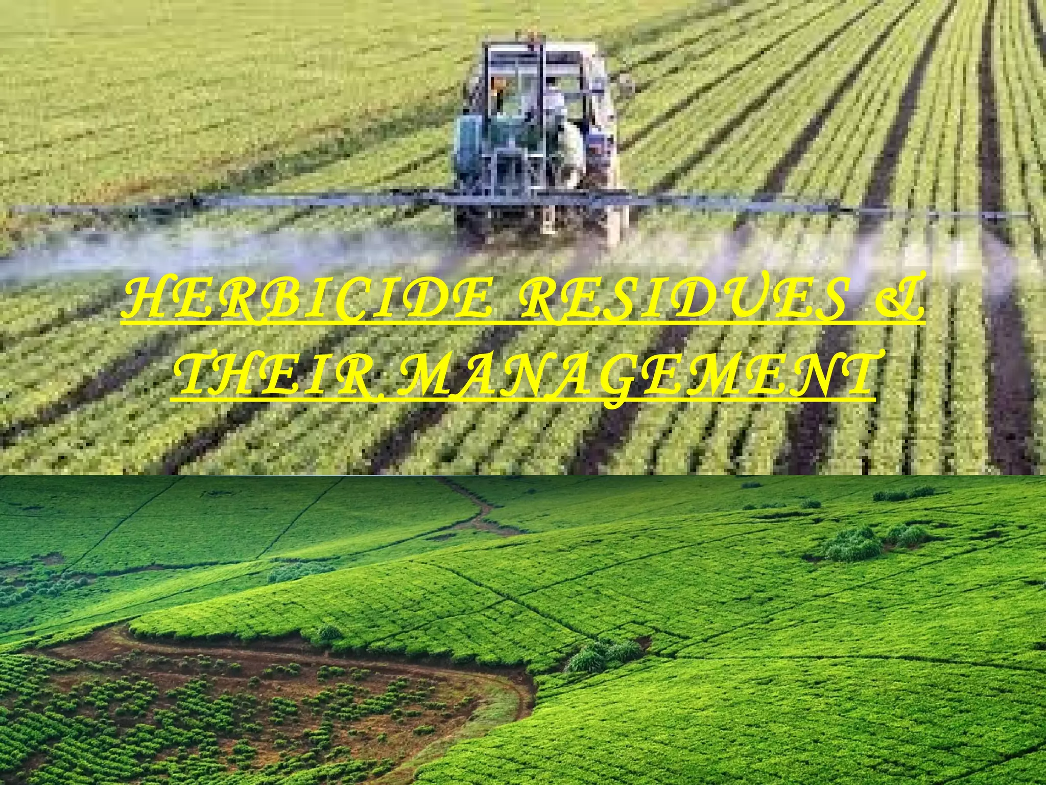 Herbicide residues can persist in soil and injure crops planted in subsequent seasons. The rate of herbicide breakdown depends on factors like the chemical properties of the herbicide, soil microbes, moisture, temperature, and tillage practices. Farmers can minimize carryover risks by selecting herbicides with short half-lives, applying the minimum effective rate, timing applications early in the season, and using crop rotations and soil additives. Determining residual herbicide levels involves field bioassays, chemical analysis of soil samples, or commercial plant bioassays.
