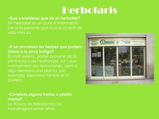 Herbolaris-Que consideres queés un herbolari? Un herbolari es un punt d’informació per a la persona que busca un estil de vida més sa.-D’on provenen les herbes que podem trobar a la seva botiga? És molt extens, poder provenir de la península o de l’extranger, tot i que normalment són autoctones, però si algú demana una planta, per exemple, japonesa també se la portem.-Coneixes alguna herba o planta mortal? La Àrnica, la Belladonna i la Mandragora entre altres.