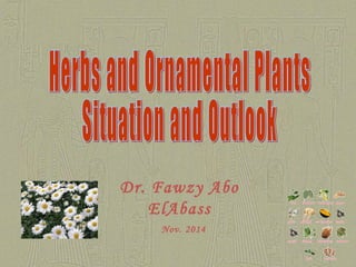 This document discusses global and Egyptian trade data for various plants, plant parts, seeds, spices, and essential oils from 2012-2013. It provides statistics on exports and imports by tons for these categories at the world level and specifically for Egypt. For world trade, it shows that China, India, Japan, Korea, the US, Germany, and EU countries are among the largest importers. For Egypt, it presents export and import data from 2009-2013 for various plants and plant parts, seeds, spices, and essential oils; in 2013 Egypt exported 41,743 tons and imported 6,863 tons of plants and plant parts. The document concludes with recommendations to meet producer and consumer demands through new varieties, early production varieties,