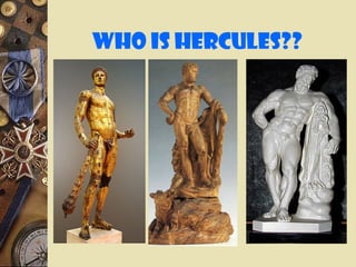 The document outlines the life and legendary twelve labors of Hercules, the greatest hero of Greece, emphasizing his immense strength, confidence, and tragic encounters. It details his birth, early challenges, and various myths surrounding his feats, including battles with formidable creatures like the Nemean lion and the Hydra. Despite his extraordinary abilities, Hercules faced personal tragedies, including being driven to madness by Hera, which led to the death of his family and his subsequent quest for redemption through the completion of the labors set by King Eurystheus.