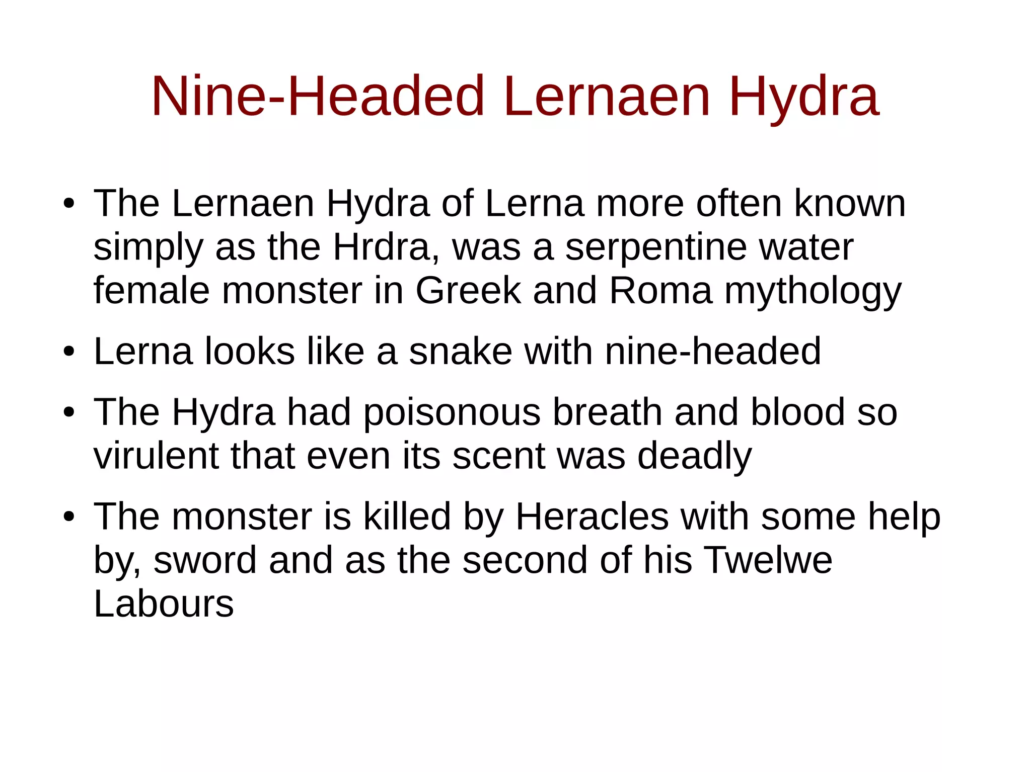 Heracles had to complete twelve labors as assigned by King Eurystheus. His first labor was slaying the Nemean Lion which had an impenetrable golden fur. He strangled the lion and used its claws to skin it. Later labors included slaying the nine-headed Lernaen Hydra and the man-eating Stymphalian Birds, which he defeated with arrows tipped with the Hydra's poisonous blood.
