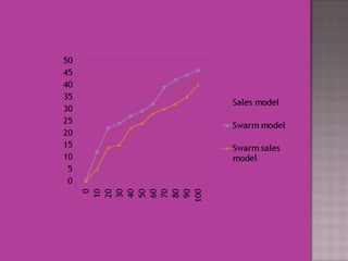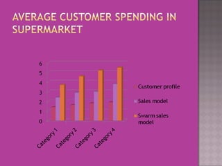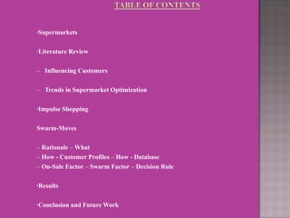 This document discusses using swarm intelligence and herd behavior to influence customer purchases in supermarkets. It proposes a Swarm Sale model that simulates customer shopping behavior. The model uses customer profiles and tracks the average choices of customers in real-time to influence others' purchases. It was found to increase sales volumes over considering just individual customer preferences or promotions. Future work could explore other factors affecting impulse buying and validating the approach in a real supermarket.