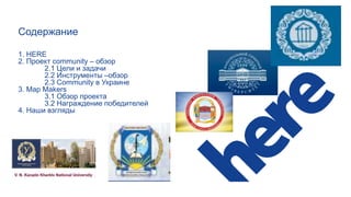 Документ описывает международный проект HERE Community в Украине, целью которого является объединение пользователей и профессионалов в области картографии. В нем рассматриваются инструменты, такие как Map Creator, для сбора и обновления картографических данных, а также планы по обучению и вовлечению студентов и преподавателей в разные проекты. Указаны преимущества участия в проекте, включая получение сертификатов, практического опыта и рекомендаций от компании HERE.