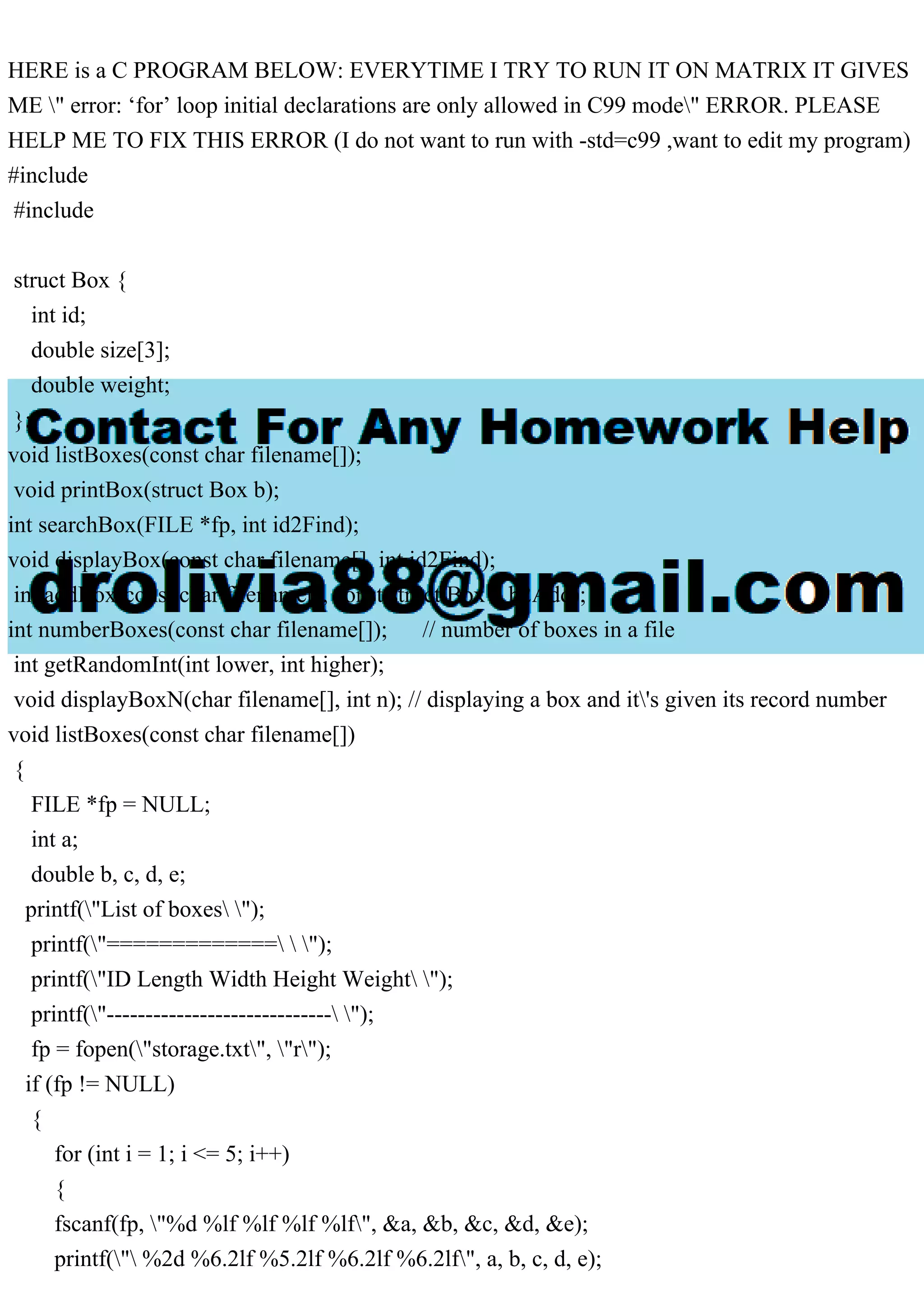 The document contains a C program that manages a storage system for boxes, allowing users to list, find, add, and randomly select boxes. An error related to C99 compliance is highlighted, specifically regarding variable declaration inside 'for' loops. The program includes various functions for file operations and user interaction through a menu interface.