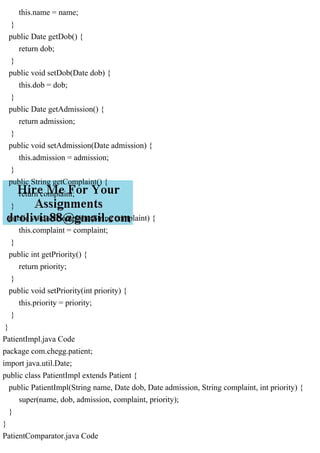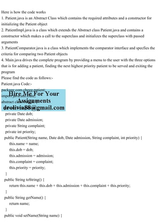 The document describes a Java program designed to manage patient data using multiple classes: an abstract class 'patient', a concrete class 'patientimpl', and a comparator class 'patientcomparator'. The main driver class facilitates user interaction to add patients, retrieve the next patient by priority, and exit the program. Key functionalities include storing patient details, comparing patients based on priority, and ordering them in a priority queue.
