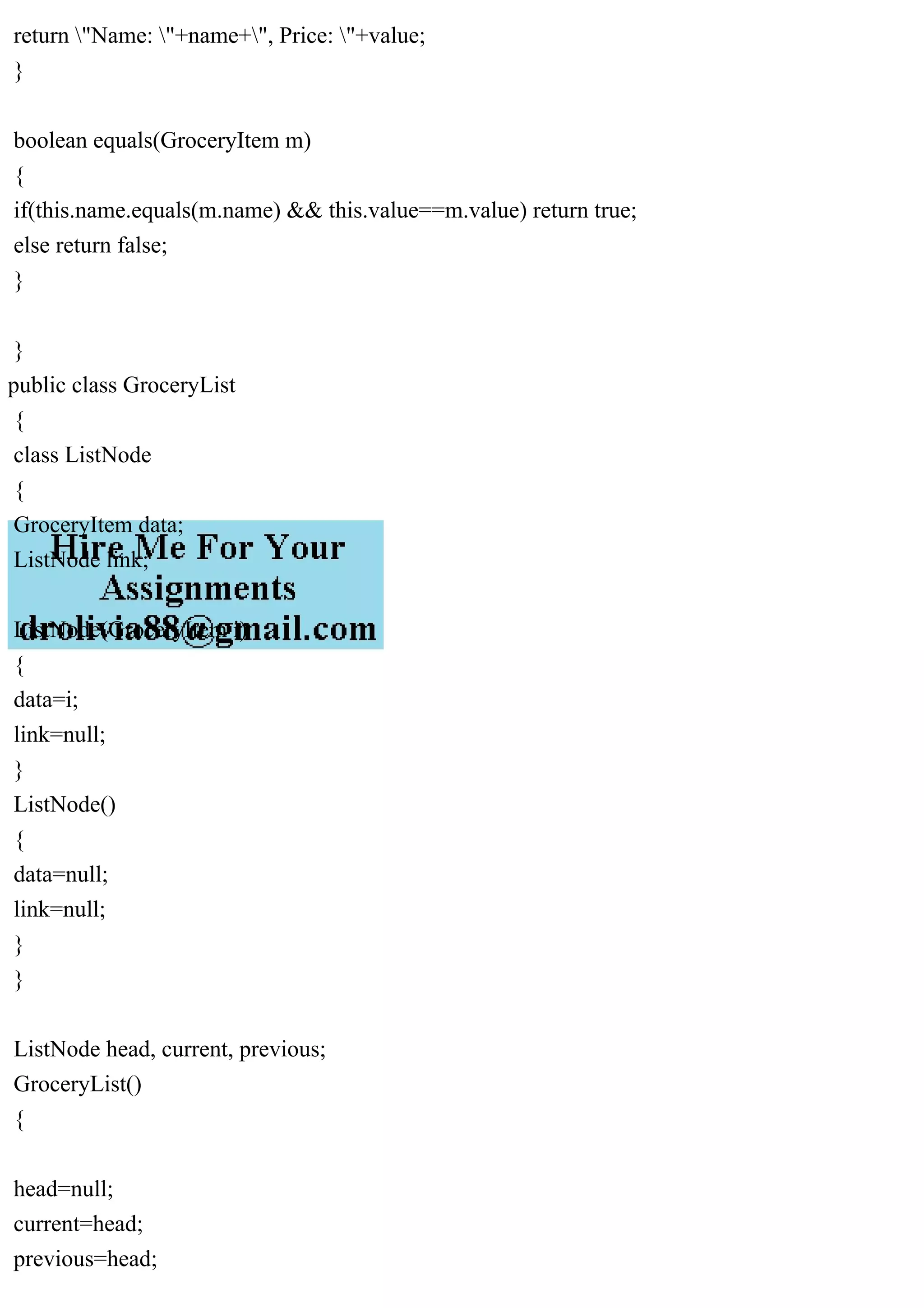 The document contains Java code implementing a grocery item and a grocery list management system. The classes allow for adding, modifying, and displaying grocery items, as well as calculating the total cost and checking for the presence of items. It includes methods for traversal, insertion, and deletion of list nodes in a linked list structure.