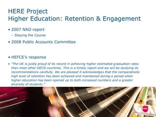 The document discusses findings from the HERE Project conducted from 2008-2011 examining student retention and engagement in higher education. Key findings include: