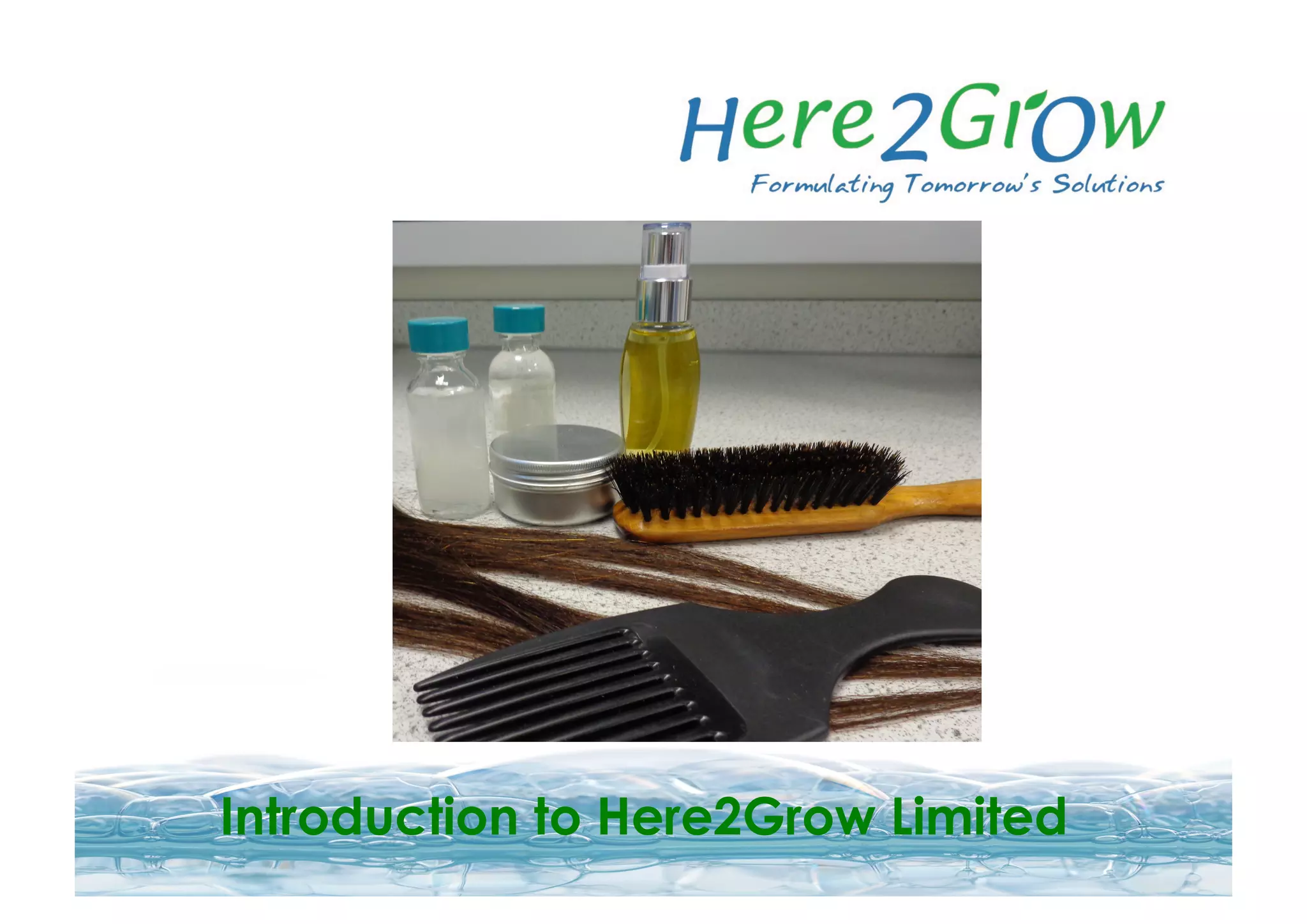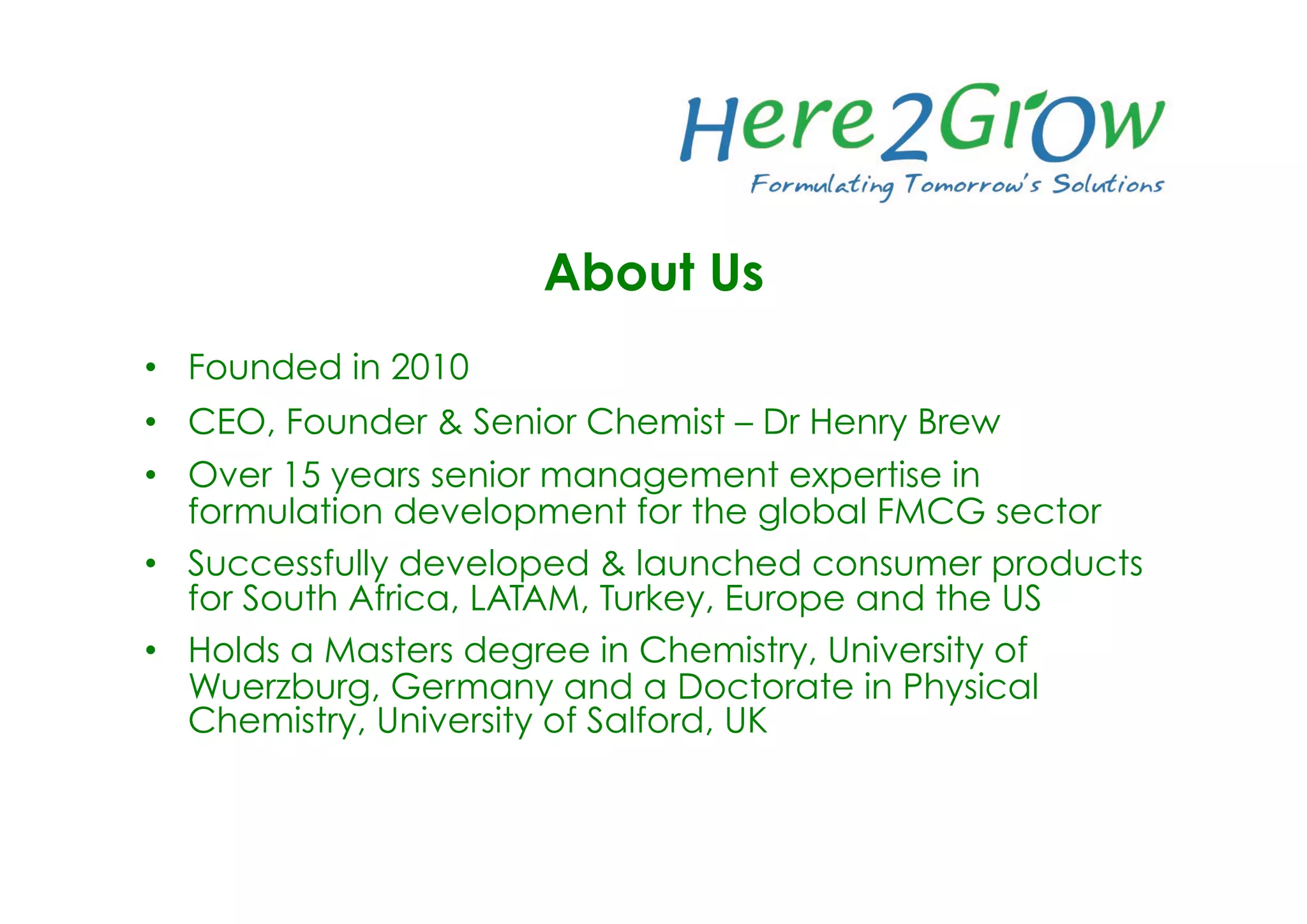 Here2Grow Limited is a contract formulation and product development company founded in 2010. Led by CEO and founder Dr. Henry Brew, who has over 15 years of experience in the FMCG sector, Here2Grow provides services such as contract formulation, new product development, analytical testing, and innovation management consulting. They work with clients across various product categories including cosmetics, personal care products, and hygiene products. Testimonials from past clients highlight Here2Grow's professionalism, customer focus, and ability to deliver desired results on complex projects.