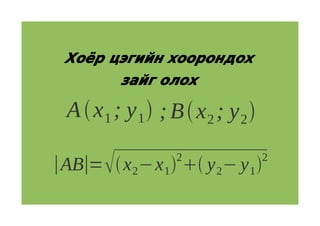 зайг олох A x1 ; y1 ; B x2 ; y2 ∣AB∣= x 2 −x 1 y 2− y 1 2 2