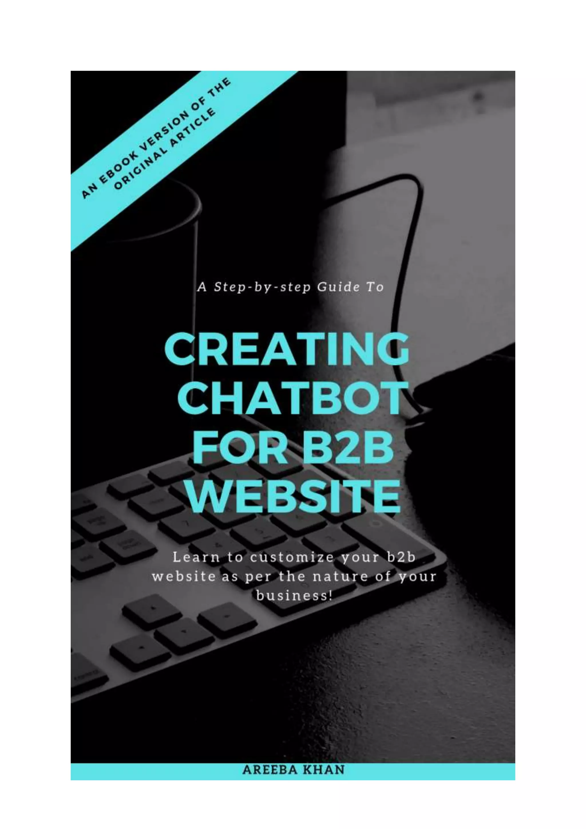 This document is an ebook guide by Areeba Khan on creating a B2B website chatbot using Botsify. It provides a step-by-step process including creating a chatbot flow, publishing the chatbot on a website, and customizing it to enhance branding and user engagement. The guide also covers advanced settings like language selection, lead collection forms, and tailored messaging for specific web pages.