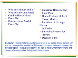 This document provides information on available house and lot packages from Heritage Homes, including financing options. It describes 3 house models (Camille, Katrina, Francesca), which are 1-storey houses with lofts ranging from 50-60 square meters. Locations mentioned are in Cavite, with amenities like clubs, pools and parks. Cash, in-house loans, and loans from Pag-Ibig or banks are offered for payment plans. Readers are encouraged to contact representatives for more details.