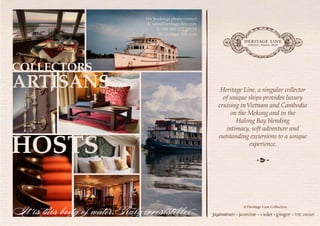Heritage Line offers luxury cruises in Vietnam and Cambodia on the Mekong River and in Halong Bay, blending intimacy, soft adventure, and outstanding excursions to provide a unique experience. Contact information is provided for booking cruises with Heritage Line via email, telephone, or website.