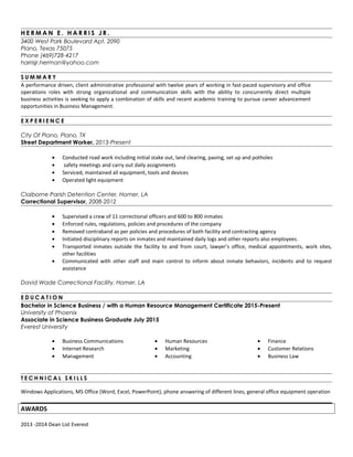 Herman E. Harris Jr. is a performance-driven administrative professional with 12 years of experience in supervisory and office operations, seeking career advancement in business management. His work includes roles in the City of Plano's street department and as a correctional supervisor, demonstrating strong organizational and communication skills. He holds a Bachelor’s in Business with a Human Resource Management certificate from the University of Phoenix.