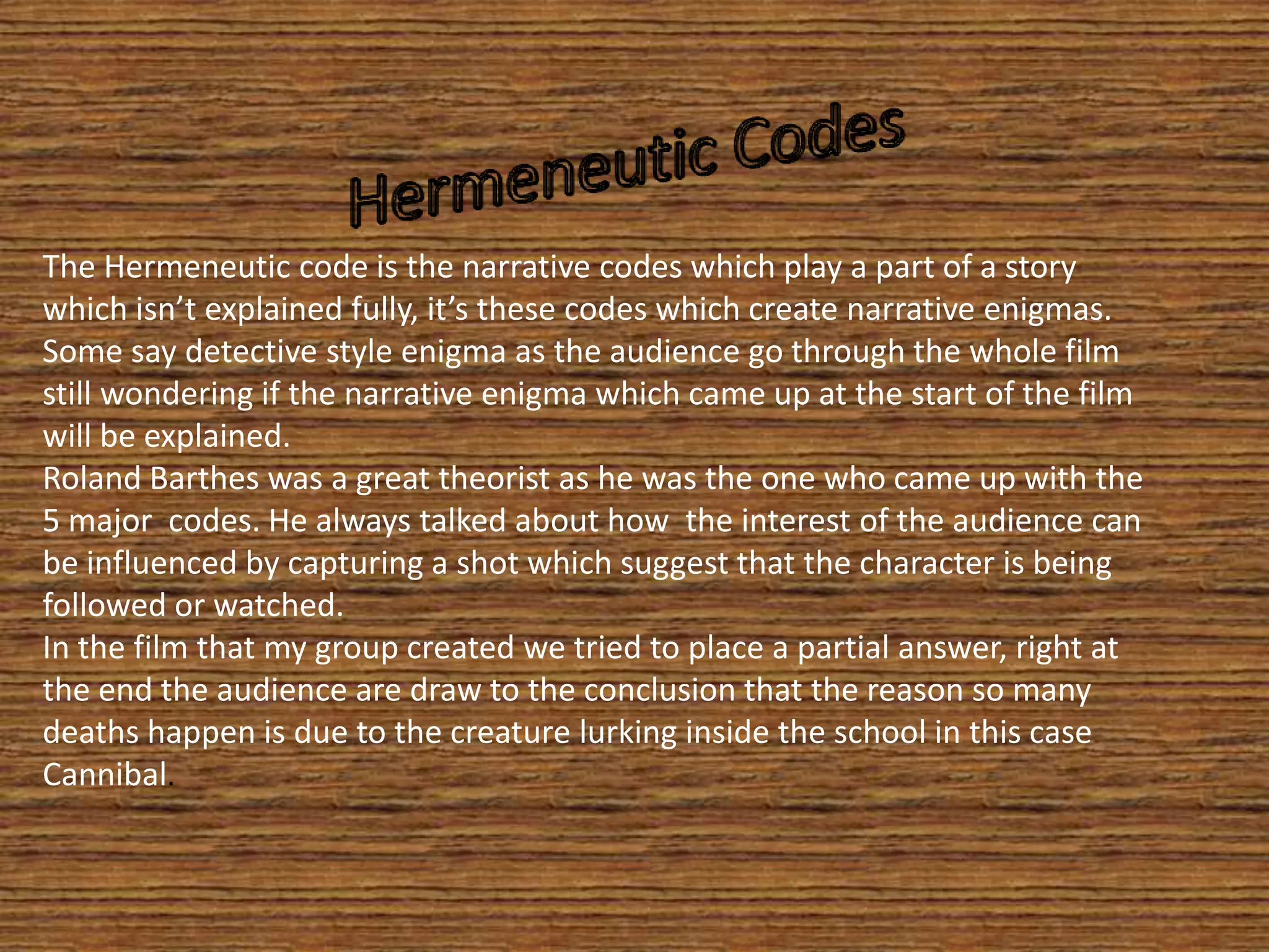 The Hermeneutic code refers to narrative enigmas or mysteries introduced in a story that are not fully explained. These codes create interest for the audience as they try to solve the mystery throughout the film. Film theorist Roland Barthes identified five major codes that can influence audience interest, such as shots suggesting a character is being watched or followed. In the film Cannibal High, the student filmmakers tried placing a partial answer at the end to draw the conclusion that the many deaths at the school were caused by a creature lurking inside, specifically referring to the creature "Cannibal".