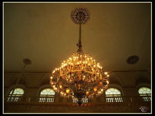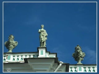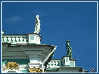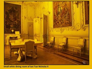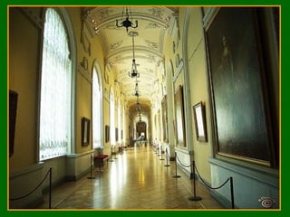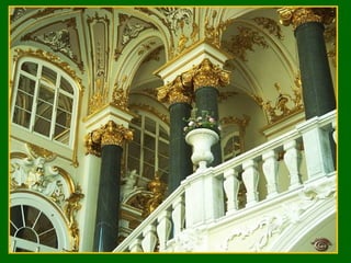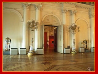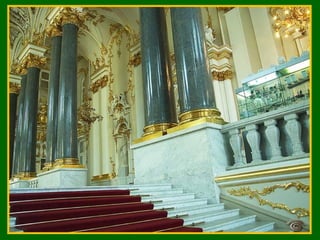 The document provides a tour of the galleries and rooms within the Winter Palace in St. Petersburg, Russia. It describes the ornate decoration of rooms like the Jordan Gallery, Malachite Room, and St. George Hall. Important artworks and artifacts from Russian history are on display, including pieces from Peter the Great's reign and galleries commemorating the Patriotic War of 1812. The tour highlights the palace's architecture, artwork, and historical significance as the former home of the Russian Tsars.