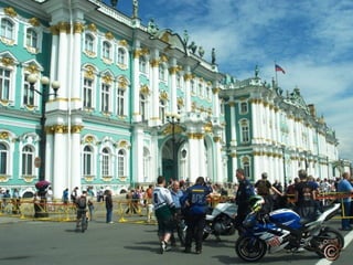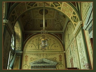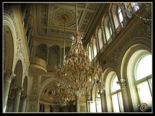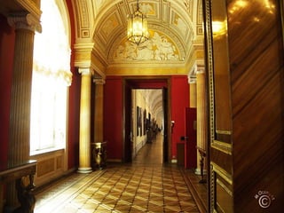 The document describes various opulent rooms and features of the Hermitage Palace and Museum, including the Pavilion Hall, grand staircases, and dedicated art rooms such as the Raphael Loggias and the Alexander Hall. It highlights architectural details such as crystal chandeliers, mosaic floors, and gilded moldings, showcasing the rich history of rooms designated for prestigious guests and French art. Additionally, it mentions specific artworks and sculptors, emphasizing the grandeur and artistic significance of the palace's interiors.