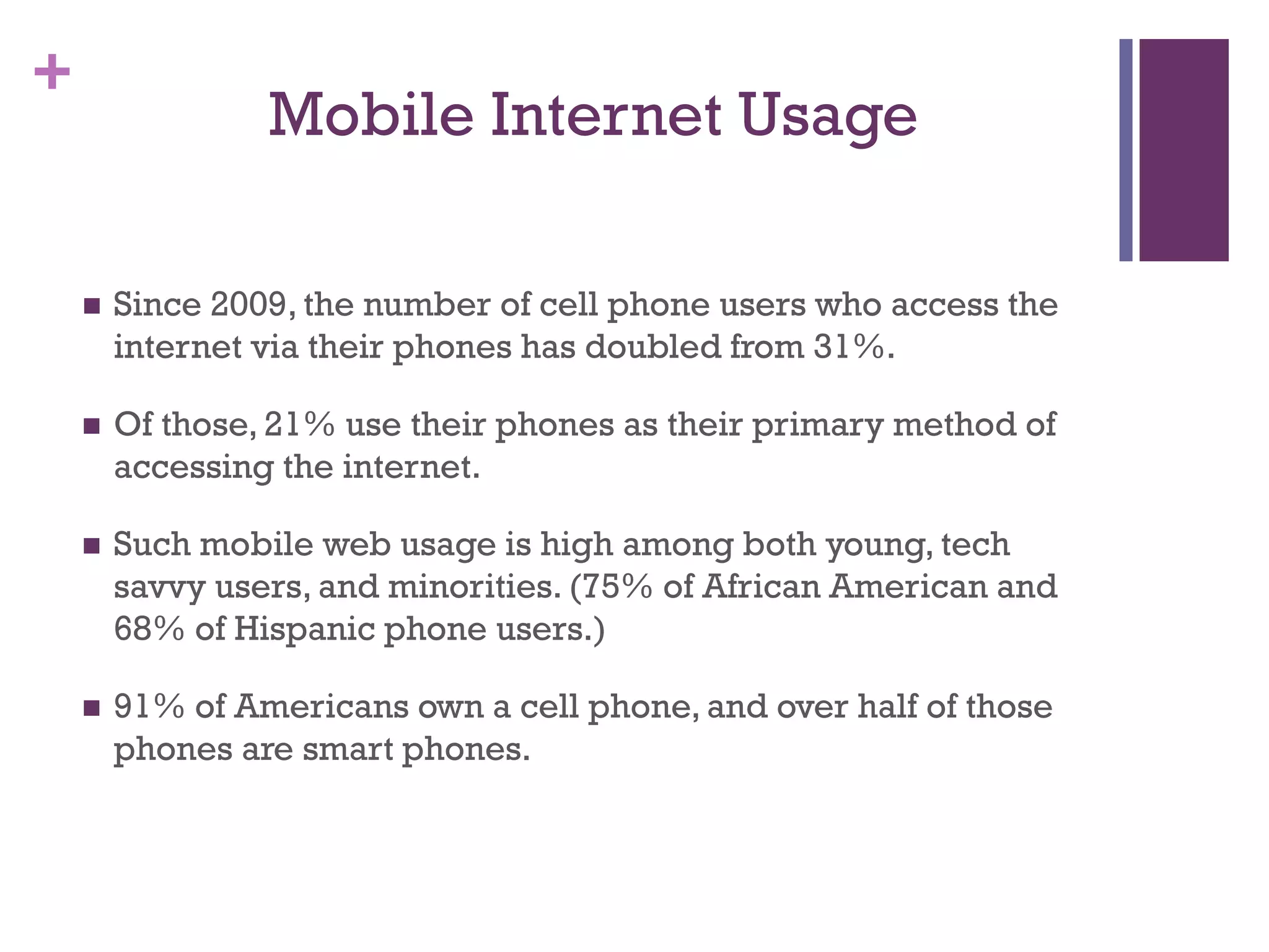 This document discusses mobile internet usage and design considerations for mobile websites. It notes that mobile internet usage has doubled since 2009, with many using mobile as their primary means of access. Some key recommendations provided include optimizing sites for mobile with lean and simple designs prioritizing functionality, ensuring quick loading times, and using tools like mobile analytics to understand user behavior on mobile. Examples of Amazon and Facebook are given as cases that effectively balance form and functionality for mobile.