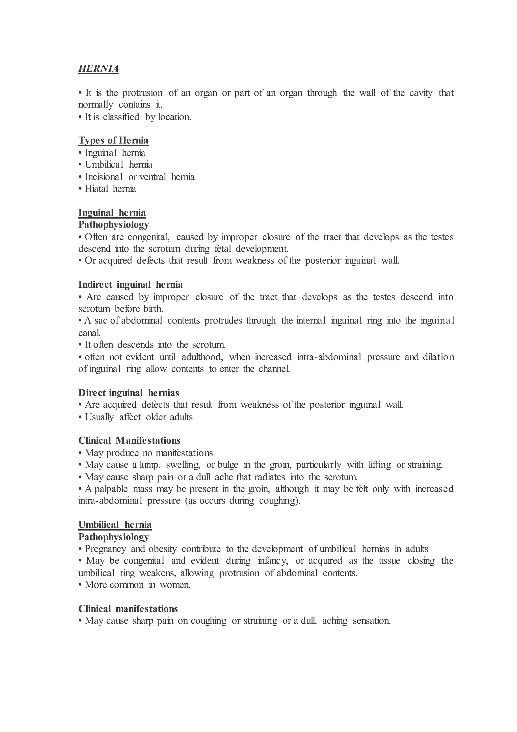 Hernias are classified by location and can be inguinal, umbilical, incisional, or hiatal. Main symptoms include bulging or pain at the hernia site. Without treatment, hernias risk becoming incarcerated, which can lead to obstruction or strangulation of intestinal tissue. Physical examination is used to diagnose hernias, while surgical repair is the typical treatment. Nurses monitor for complications and provide pain management, education, and support to hernia patients.