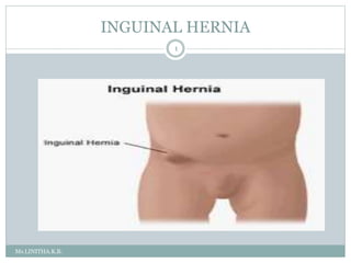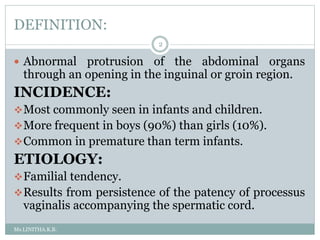 Inguinal hernia is an abnormal protrusion of abdominal organs through the groin region. It most commonly occurs in infants and boys. It is caused by a failure of the processus vaginalis to close after testicular descent. Types include direct and indirect hernias. Clinical features include a painless swelling in the groin that reduces with crying. Management involves early elective surgery to repair the defect. Umbilical hernia involves a weakness at the umbilical ring allowing intestinal contents to protrude. It often closes spontaneously by age 5 without surgery. Diaphragmatic hernia is a congenital defect where abdominal organs protrude into the chest cavity through an opening in the diaphragm.