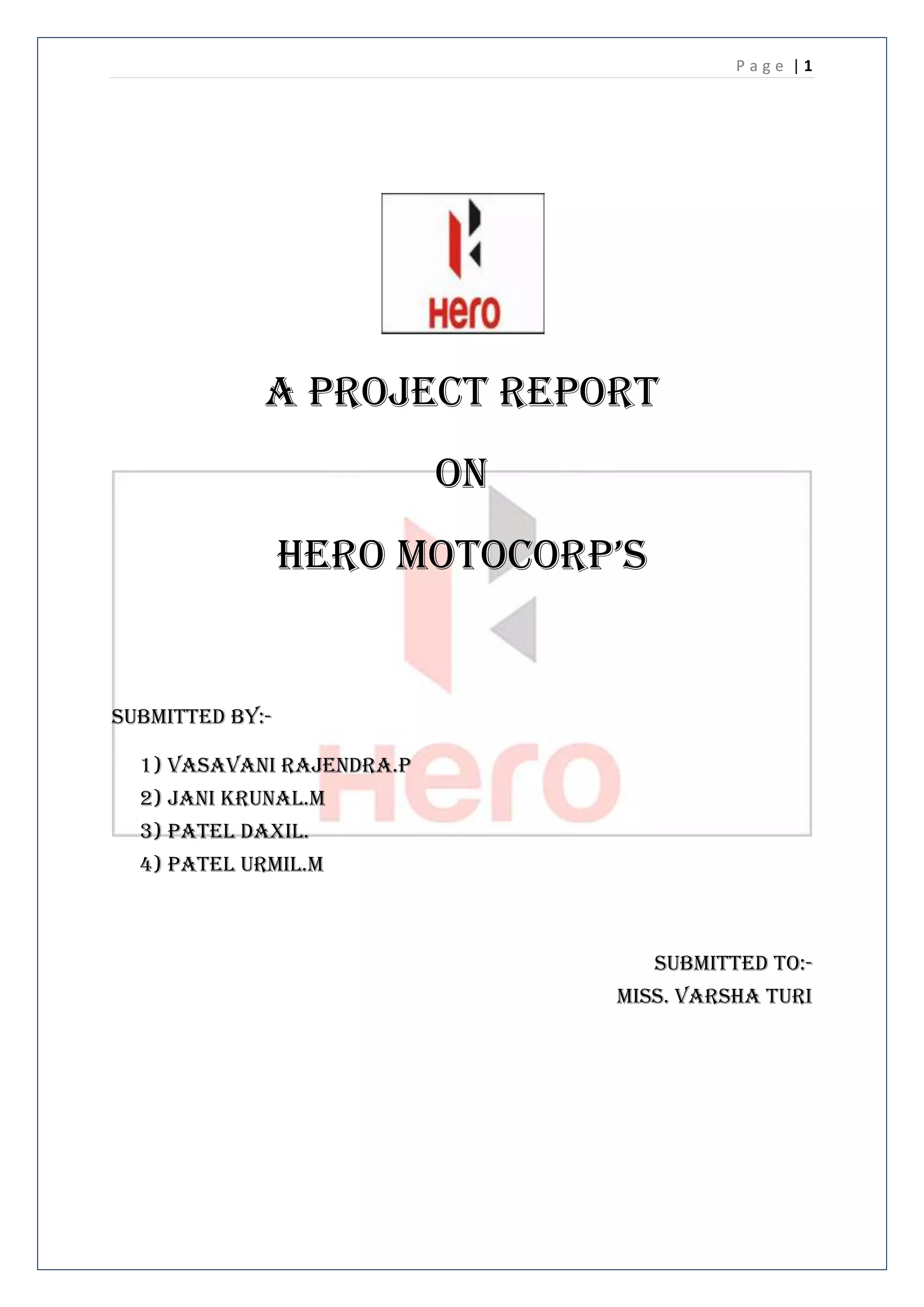 This document provides an overview of a project report submitted to Miss. Varsha Turi on Hero Motocorp. It includes an acknowledgment section thanking those who provided assistance. It also includes a preface noting that the report was prepared as part of an MBA program to develop practical business knowledge. The report then provides an introduction to Hero Motocorp's history and details.