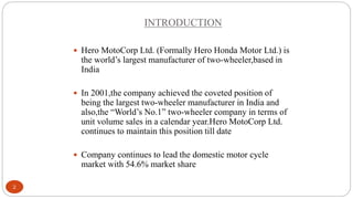 Hero MotoCorp is the world's largest manufacturer of two-wheelers based in India. It has maintained the number one position globally in terms of annual unit sales since 2001. The company has a 54.6% market share in India's motorcycle market. Hero MotoCorp was formerly a joint venture between Hero Group and Honda called Hero Honda until 2010, when Honda exited the venture. The company produces a wide range of motorcycles and scooters. Its mission is to become a global enterprise meeting customer needs for mobility. The company aims to expand its global footprint and double its unit sales within five years.