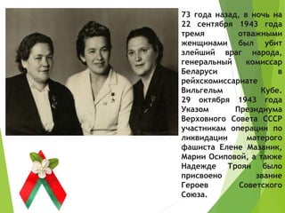 Документ описывает подвиг трех советских женщин, которые в 1943 году убили генерального комиссара Беларуси Вильгельма Кубе, за что были удостоены звания героев Советского Союза. В тексте подчеркивается их храбрость, анализ и способность к планированию сложной операции, а также их последующая жизнь и достижения после войны. Описание акцентирует внимание на личной зрелости и ответственности этих женщин, несмотря на их ограниченное образование.