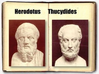 Herodotus and Thucydides were two of the earliest Greek historians. Herodotus, who lived in the 5th century BC, is considered the "Father of History" as he was one of the first historians to investigate events and write accounts of the past. He traveled widely and wrote about the Greco-Persian wars. Thucydides, a contemporary of Herodotus, is renowned for his history of the Peloponnesian War between Athens and Sparta from 431-404 BC. He is considered the father of scientific history for applying rigorous standards of evidence gathering and analysis. Both historians made major contributions to the development of history as an academic discipline.
