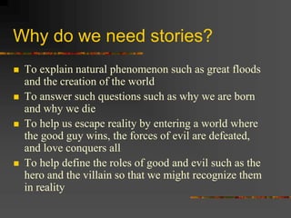 Why we need stories is to explain natural phenomena, answer life's big questions like why we are born and die, and help us escape reality into a world where good triumphs over evil. Archetypes are recurring patterns of characters, symbols, and situations that are part of the collective unconscious and connect humanity across time and cultures. There are character archetypes like the hero, mentor, and devil figure as well as situational archetypes like the quest and fall from grace and symbolic archetypes involving themes of light vs dark, heaven vs hell, and nature vs machines.