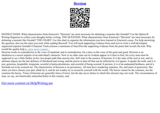 The document discusses the characteristics of heroism according to Emerson's essay "Heroism" and how they relate to defeating the monster Grendel in the poem Beowulf. It instructs the reader to use the provided writing organizer chart to collect thoughts on Grendel's character traits and how qualities of heroism from Emerson's work could help overcome those traits. Key characteristics mentioned from Emerson include self-trust, courage, fortitude, and persistency. The document examines how these heroic qualities may have aided in Grendel's defeat.