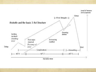 The document discusses various structures for storytelling, including the hero's journey, three-act structure, and short film structure. The hero's journey involves a hero leaving their normal world and encountering challenges in a special world before returning home with experience. The three-act structure divides a story into a beginning, middle, and end. Short films still benefit from rising tension, climax, and resolving a character's goal or obstacle within a condensed format.