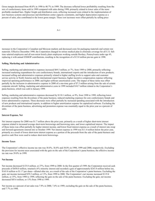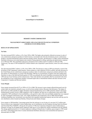 This document provides an analysis of Hershey Foods Corporation's financial condition and results of operations. It discusses increases in net sales and gross margin from 1999 to 2000 primarily due to lower raw material costs. Selling and administrative expenses also increased from 1999 to 2000 due to higher marketing and staffing costs. In 2000, Hershey acquired Nabisco's mint and gum businesses for $135 million. The acquisition increased assets but did not materially impact 2000 results. Cash flow from operations and prior asset sales exceeded capital expenditures, share repurchases and dividends. Liquidity remains strong with continued capital investments planned.