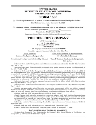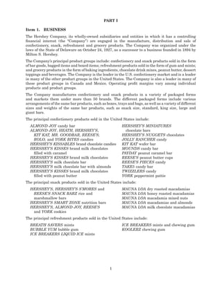 The document is The Hershey Company's annual report filed with the SEC for the fiscal year ended December 31, 2005. It provides information on Hershey's business operations including that it manufactures, distributes and sells confectionery, snack, refreshment and grocery products. It operates in the United States, Canada and Mexico and markets over 50 brands. The report lists the company's principal product groups and brands of confectionery, snack and refreshment products sold in the US. It also discusses the acquisitions of Joseph Schmidt Confections and Scharffen Berger Chocolate Maker in 2005.