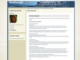 The document provides an overview of the role of a librarian in residence at the University of Notre Dame. It discusses how librarians acquire and organize resources, assist faculty and students in research, and teach information literacy skills. Examples of resources covered include books, journals, databases, citations tools, and subject guides.